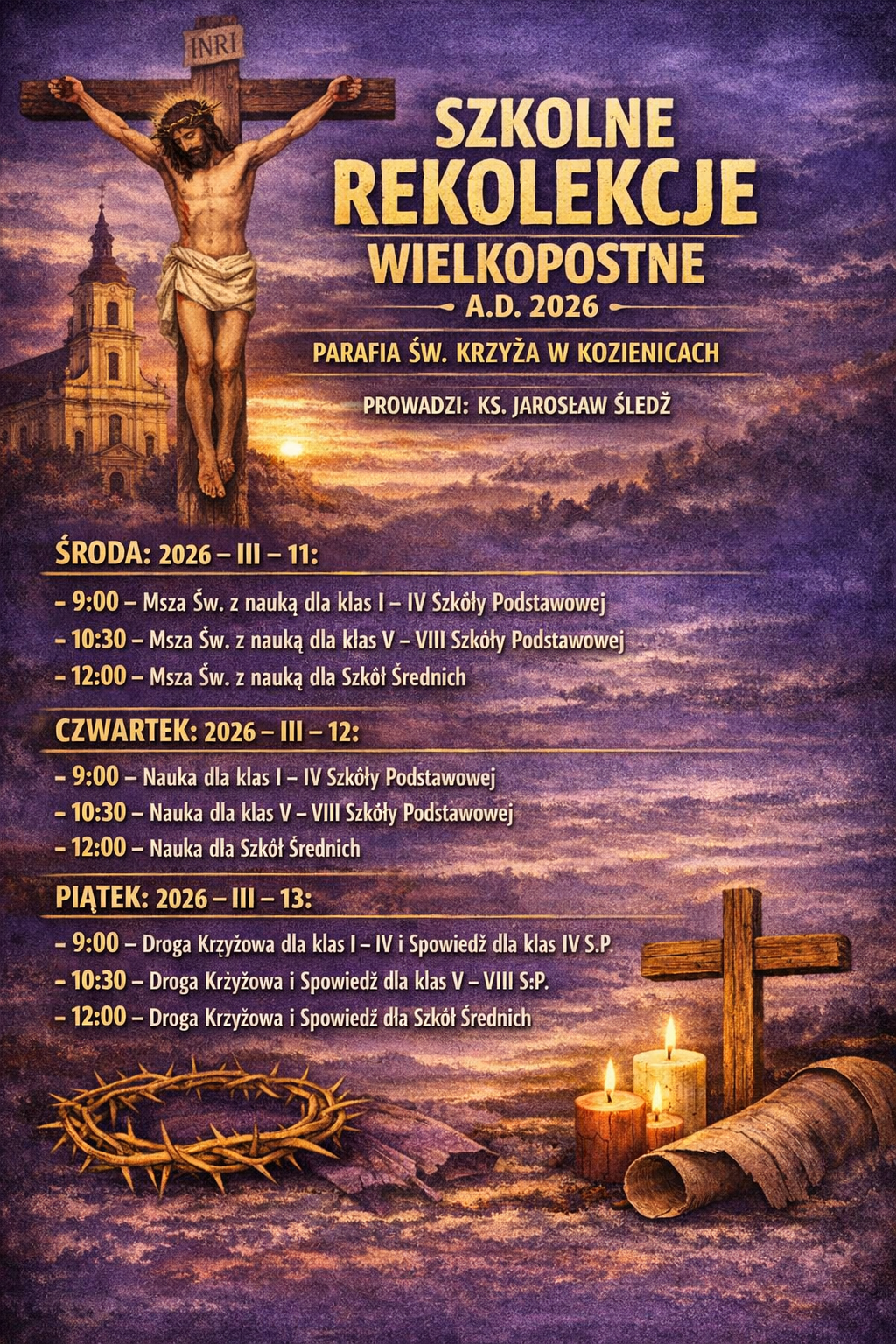 SZKOLNE REKOLEKCJE WIELKOPOSTNE A.D. 2026: PROWADZI: KS. JAROSŁAW ŚLEDŹ ŚRODA: